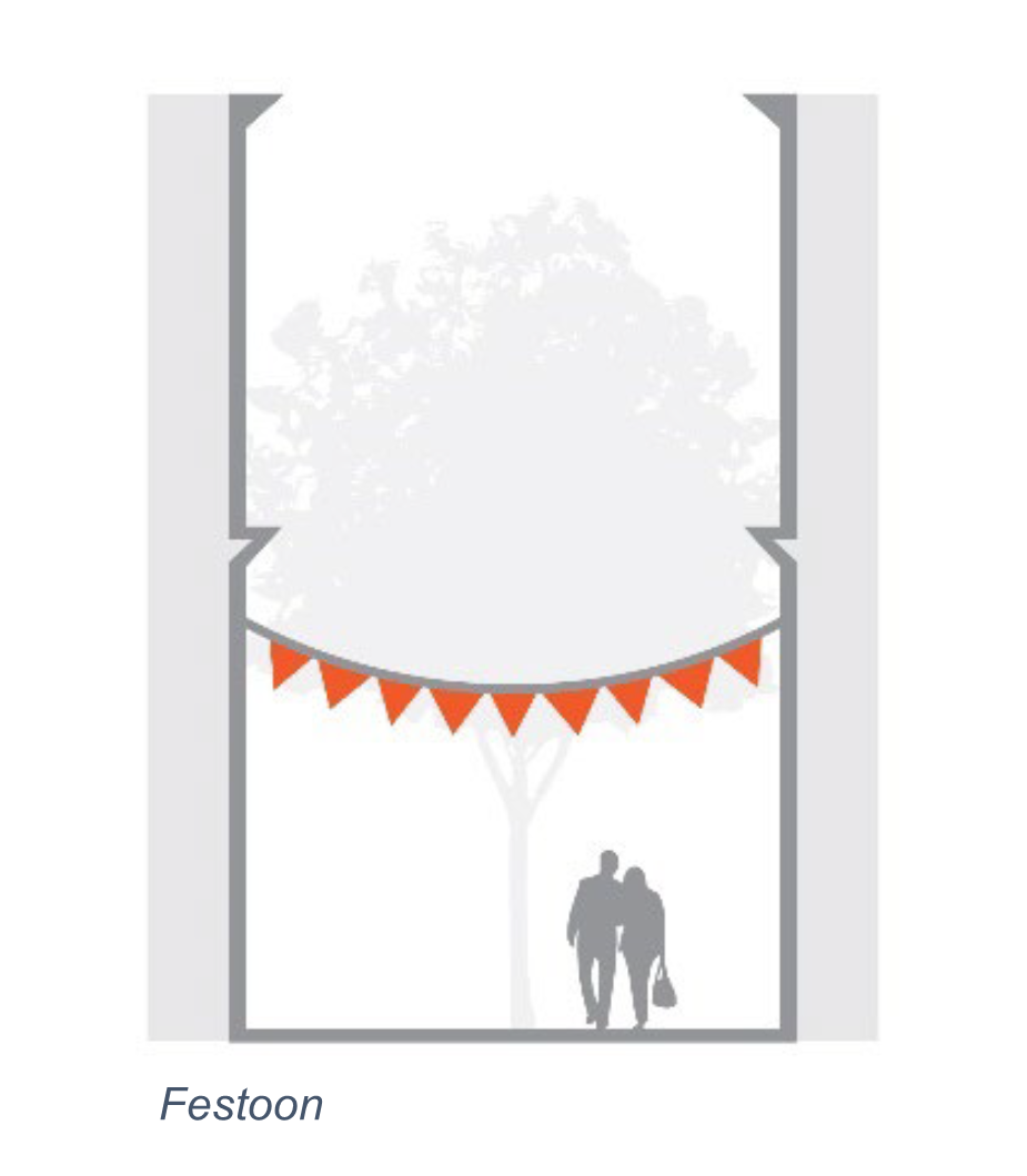 Festoons. A string of ribbons, pennants, spinners, streamers, tinsel, small flags, pinwheels, or lights typically strung overhead and/or in loops.