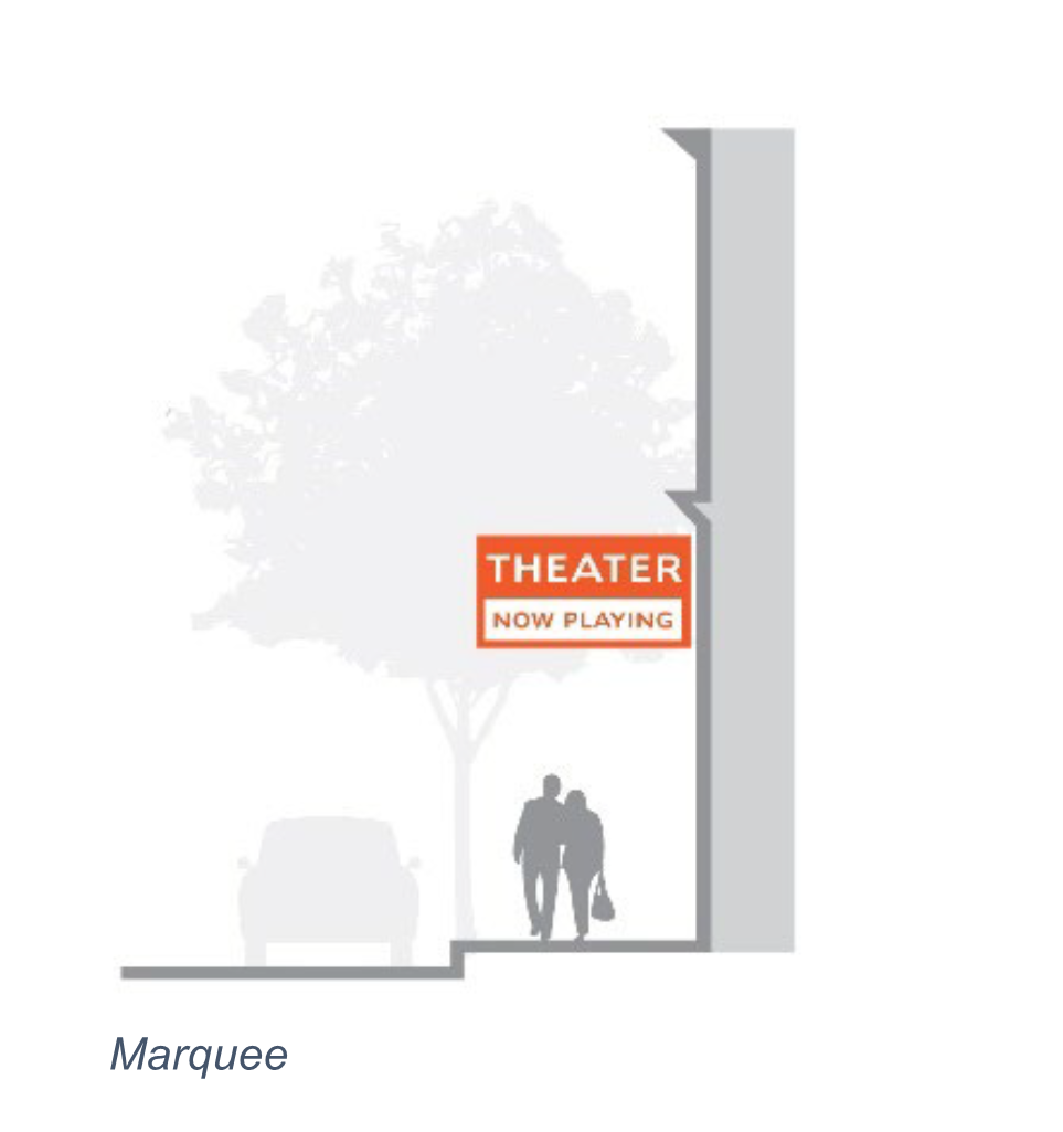 Marquee sign. Any permanent roof-like structure constructed of permanent materials projecting beyond a building or extending along and projecting beyond the wall of the building. Generally, a marquee is designed and constructed to provide protection from the weather. The marquee sign is affixed to, in any manner, or made part of the marquee and often includes a changeable copy component in addition to the display of a permanent message.