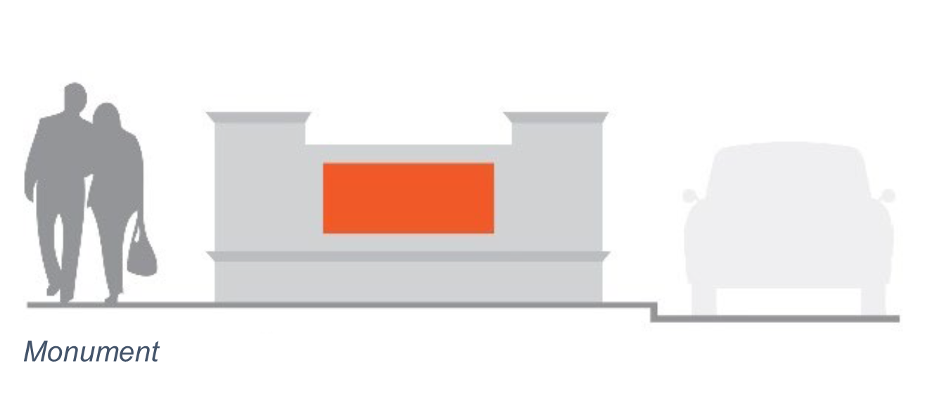 Monument sign. A base-mounted, freestanding sign placed on the ground and not attached to any building or other structure. A monument sign includes a solid supporting base of at least 24 inches in height and a width equal to or greater than the width of the sign face.
