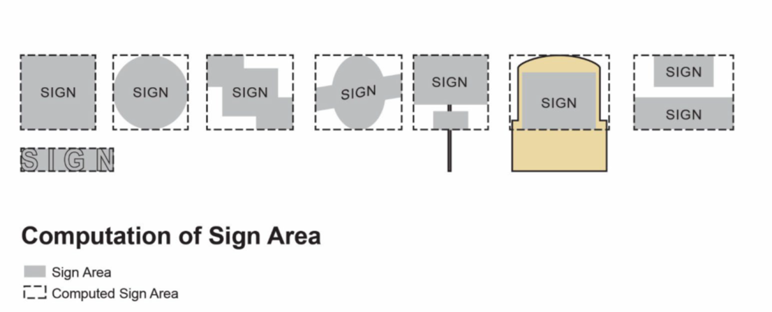 Signable area. Signs are measured as the area within a single, continuous perimeter composed of the smallest square, circle, rectangle, triangle, or combination thereof that will encompass the extreme limits of the writing, representation, emblem, or other display. This includes any frame or other material or color, forming an integral part of the background of the display or used to differentiate the sign from the background against which it is placed.