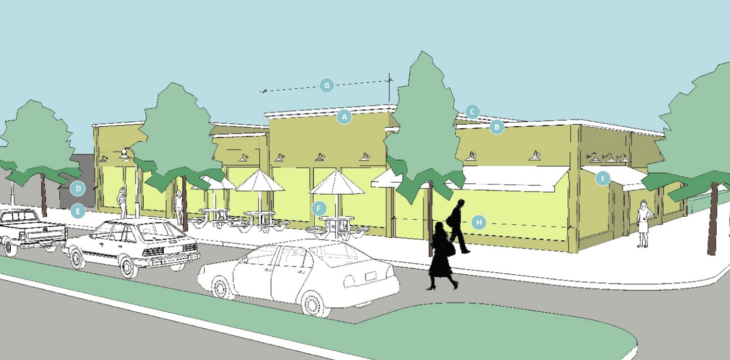 MU-1, Neighborhood Mixed-Use District. Buildings are setback from the street with a landscaped or activated front yard area (e.g., an outdoor dining area). Parking may be in the front of the building (this building typology is especially relevant to Kelly Road where the existing buried utilities restricts building footprints closer to the road. Sites have a ten-foot pedestrian sidewalk to provide for enhanced placemaking activities and support a parkway design. The following design requirements apply: