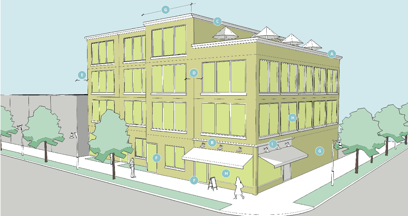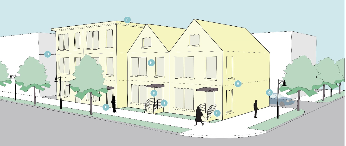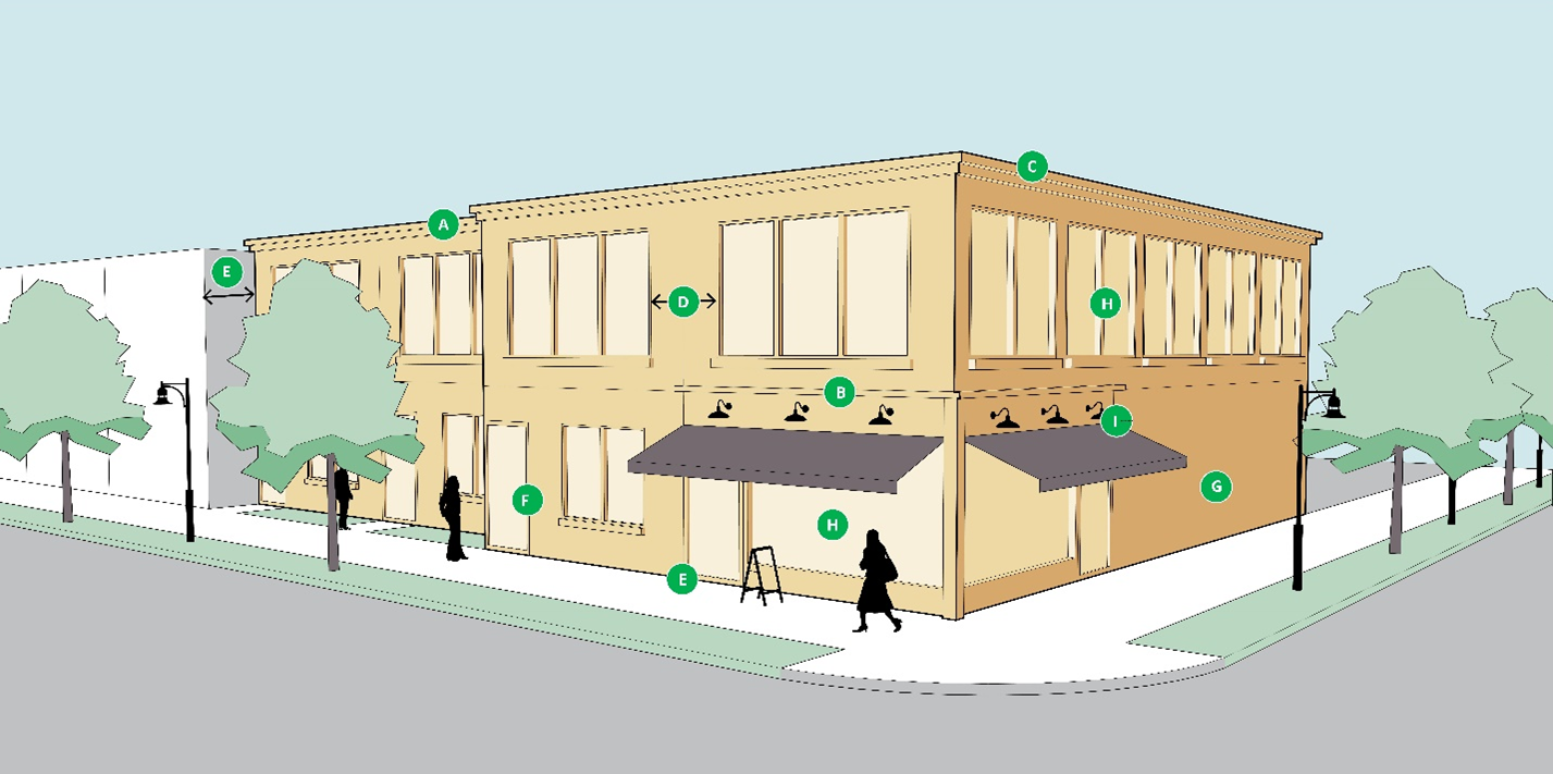 The following sections detailed standards for building design and form: while some criteria are relevant for all projects in each zoning district (e.g., lighting and materials), other criteria are specifically relevant to particular mixed-use district development projects with the intent to design an attractive commercial district.