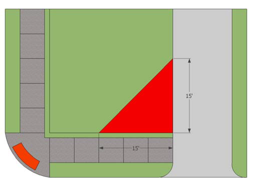 Within a triangular area formed at the intersection of a driveway serving a nonresidential or multiple family use with a street or alley right-of-way line, or interior property line, by a straight line extending between the right-of-way line or interior property line and the nearest edge of the driveway at a point 15 feet along the right-of-way line, or interior property line and the intersecting driveway line.
