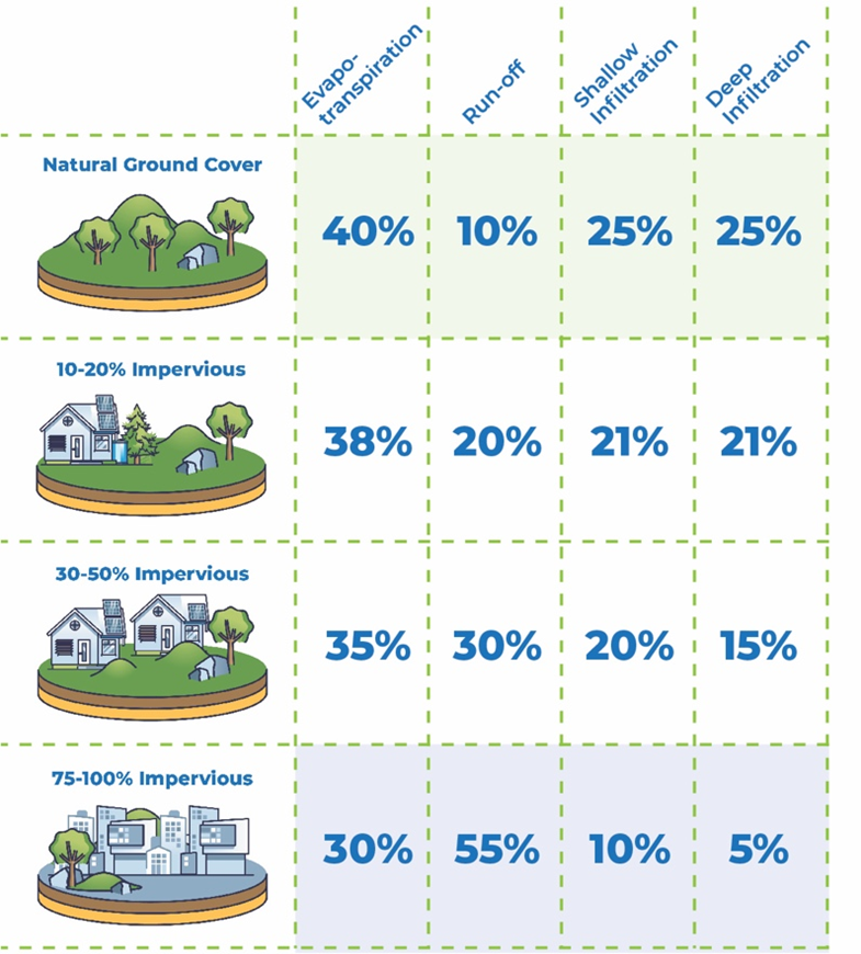 Promote natural surface infiltration: Counteract the environmental impacts of impervious surfaces by preserving green, undeveloped spaces. (See Figure A. for pervious vs. impervious impacts)