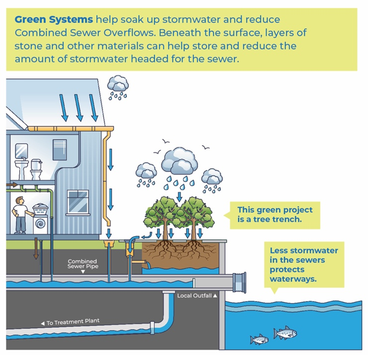 Decrease flooding risks: Manage the volume of stormwater runoff from residential and commercial areas. Recognizing the significant amount of water from rainfall that can contribute to overflow in combined storm drains and water management systems. (See Figure B. for stormwater impacts on combined sewer diagram)