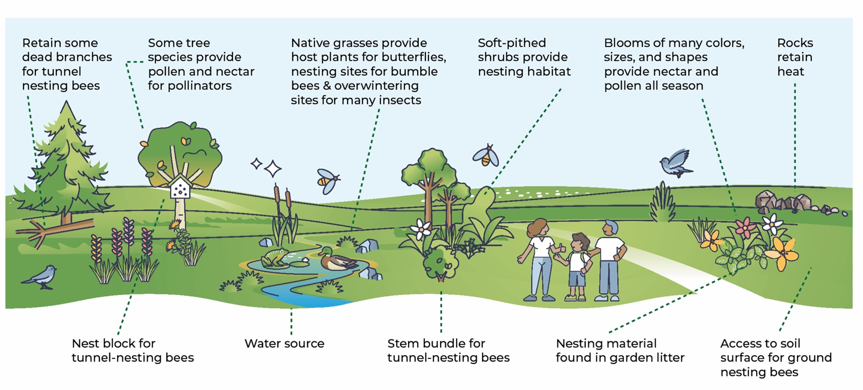 Planting pollinator habitat. Enhancing pollinator habitats through the strategic use of native plants and sustainable gardening practices can significantly contribute to the health and diversity of local ecosystems. (Refer to Green Macomb's Residential Planting Guidance for design considerations and best planting practices)