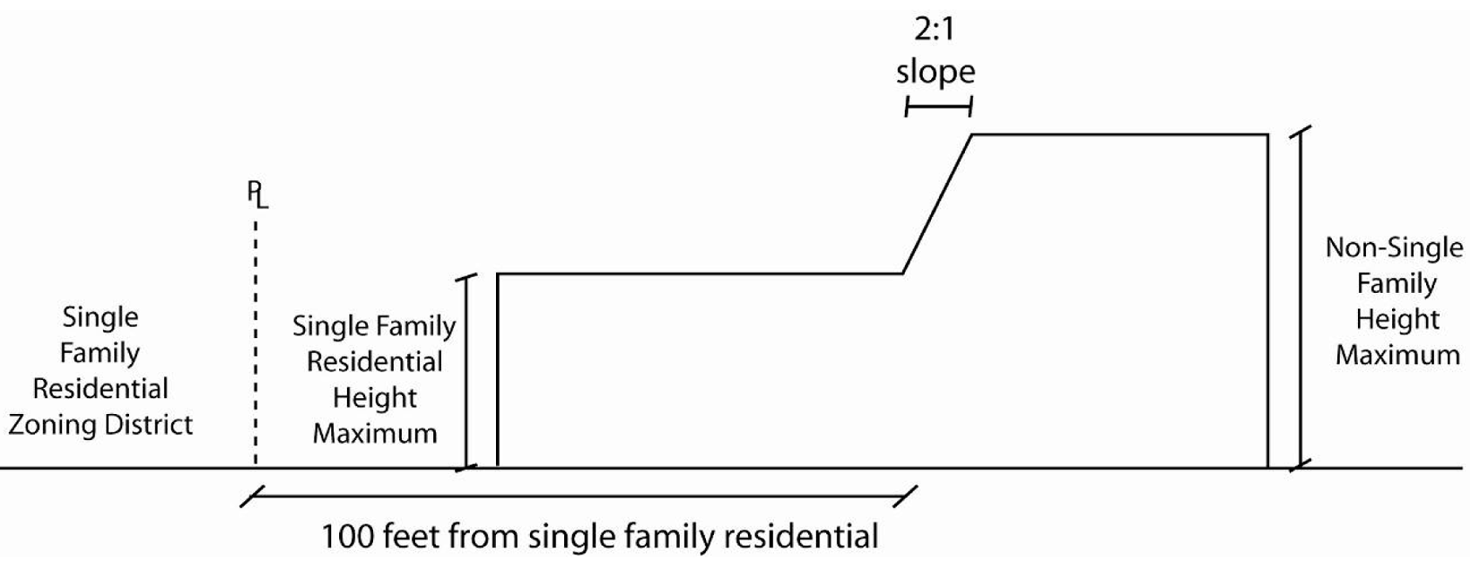 Height compatibility with single-family development. Whenever a structure is proposed on a lot that is adjacent to a single-family residential zone, the proposed structure shall maintain the same maximum height allowed in the adjacent single-family residential zone within 100 feet of the shared property line. From that point measured 100 feet from the shared line, the maximum height of the proposed structure may increase to the maximum allowed by its underlying zoning at a 2:1 ratio (see figure 5.1-1, height compatibility with single-family development). In the instance where the zones are separated by a public right-of-way, this rule shall still apply and the 100-foot distance measurement shall begin from the property line of the residential zone adjacent to the right-of-way.