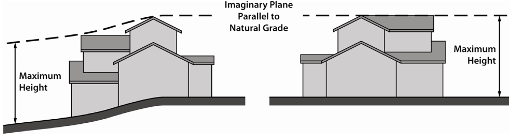 Height measurement. The height of a structure shall be measured as the vertical distance from the finish grade of the site to an imaginary plane located within the allowed number of feet above and parallel to the grade (see figure 5.1-2, measurement of height).
