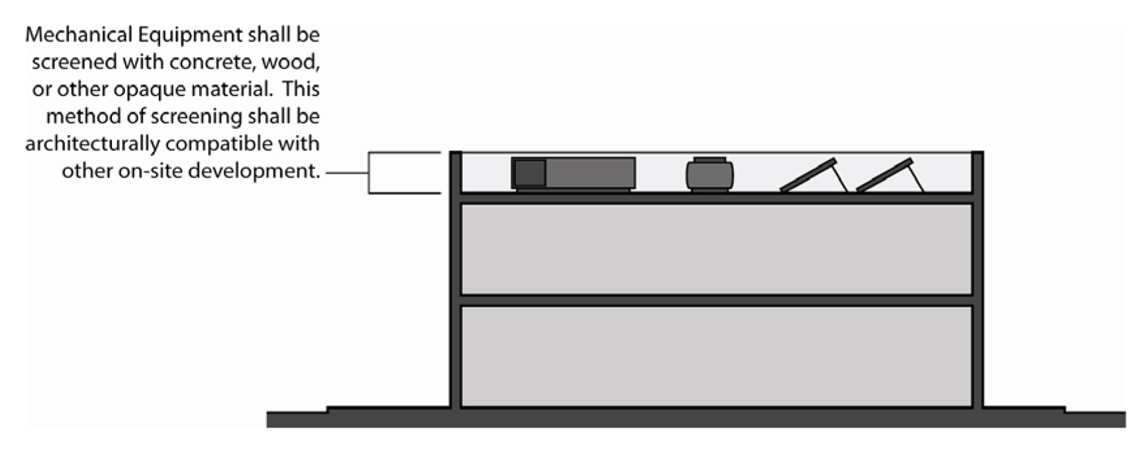 Screening of roof-mounted equipment. Roof-mounted mechanical equipment shall be screened in compliance with the following standards (see figure 5.3-3, screening of roof-mounted equipment):