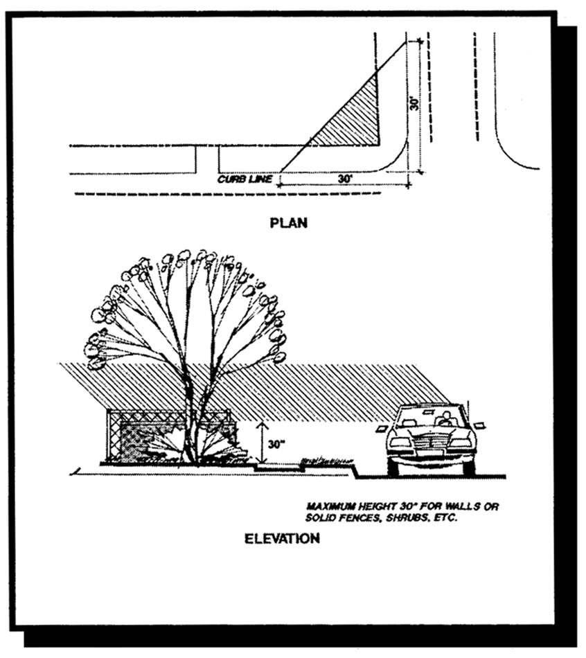 No fence shall be erected or maintained in such a way as to obstruct the vision of motorists exiting driveways. No fence or wall in a front yard on a corner lot, with a triangular section of land formed by the two (2) street right-of-way line and line connecting them at points thirty (30) feet from the intersection of such right-of-way line, shall exceed thirty (30) inches in height above the curb level.