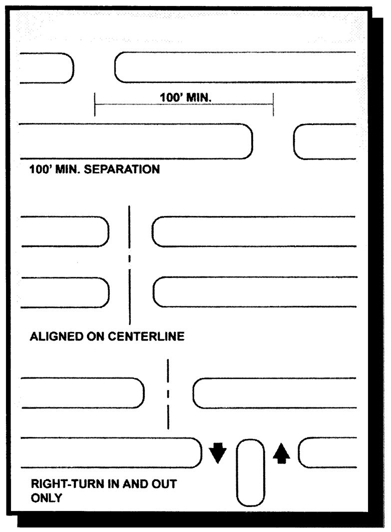 Driveways shall be directly aligned with those across the street or, where offset, the minimum driveway spacing from driveways across the street shall be one hundred (100) feet excluding when one (1) or both driveways are designed and signed for right-turn in/right-turn out only.