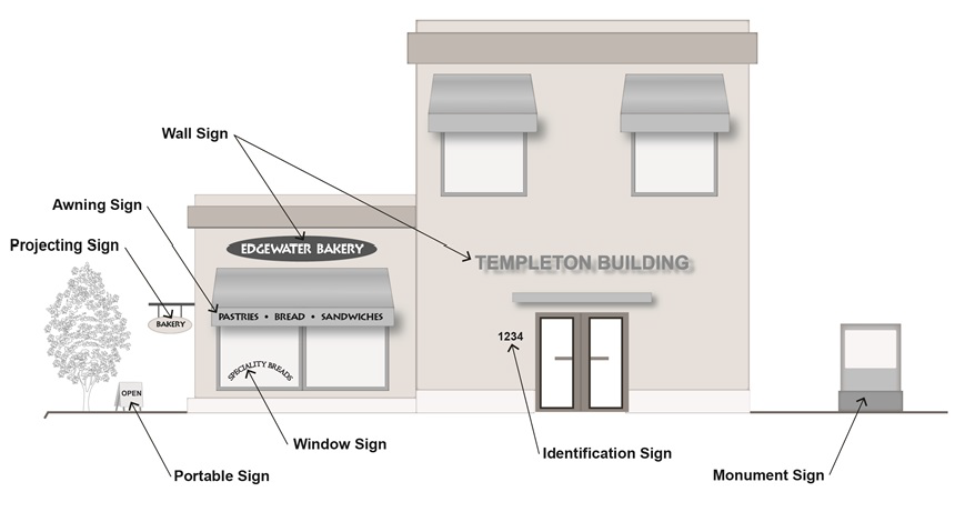 Sign type. Signs may be of wall, monument or projecting type (but not projecting over public property).