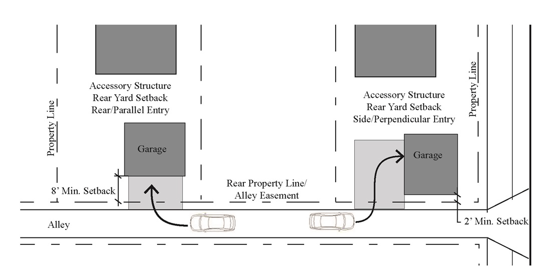 The minimum depth of the rear yard shall be twenty (20) feet from the rear of the dwelling or the principal building, and no accessory building or structure shall be closer than two (2) feet to the rear lot line or alley right-of-way line, if any, except that any garage which has vehicular ingress and egress through the rear lot line to the alley and which has an angle between the rear lot line and the wall of the garage containing the vehicle access door of less than forty-five (45) degrees, shall not be located any closer than eight (8) feet from the rear lot line or alley right-of-way line, if any.