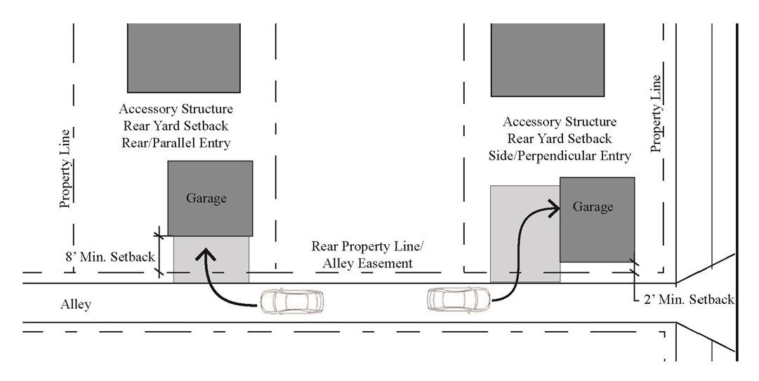 The minimum depth of the rear yard shall be twenty (20) feet from the rear of the dwelling or the principal building, and no accessory building or structure shall be closer than two (2) feet to the rear lot line or alley right-of-way line, if any, except that any garage which has vehicular ingress and egress through the rear lot line to the alley, and which has an angle between the rear lot line and the wall of the garage containing the vehicle access door of less than forty-five (45) degrees, shall not be located closer than eight (8) feet from the rear lot line or alley right-of-way line, if any.