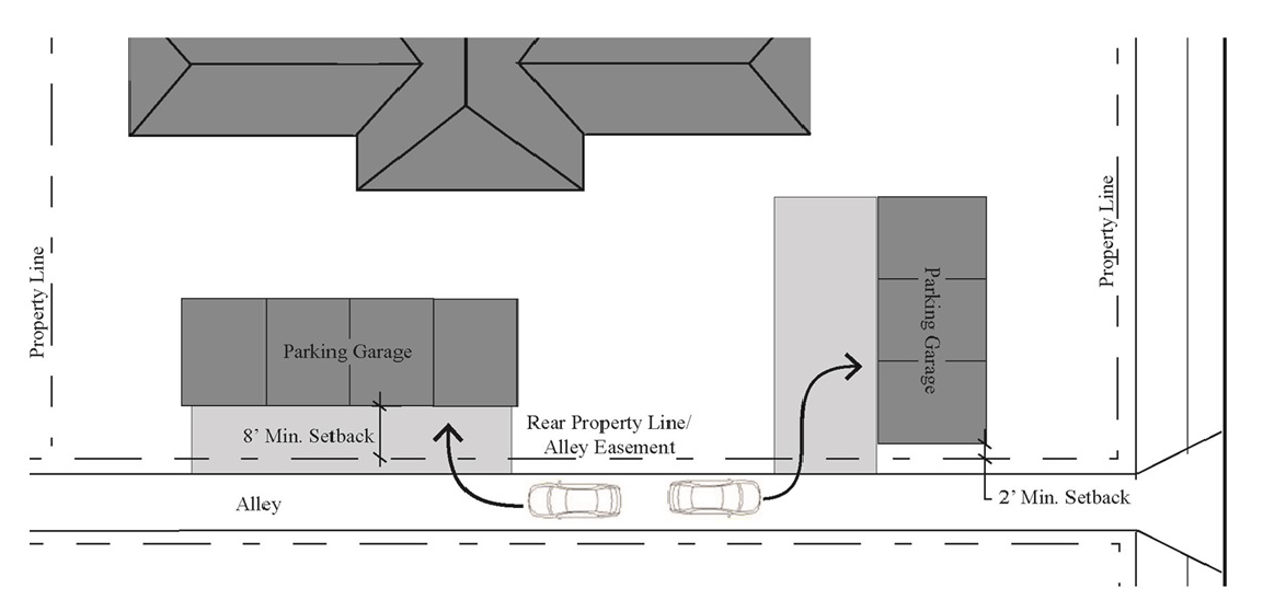The minimum depth of the rear yard shall be fifteen (15) feet from the rear of the dwelling or the principal building, and no accessory building or structure shall be closer than two (2) feet to the rear lot line or alley right-of-way line, if any, except that any garage which has vehicular ingress and egress through the rear lot line to the alley and which has an angle between the rear lot line and the wall of the garage containing the vehicle access door of less than forty-five (45) degrees, shall not be located any closer than eight (8) feet from the rear lot line or alley right-of-way line, if any.