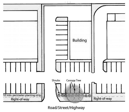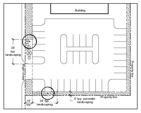 Perimeters not adjacent to public rights-of-way: In addition to subsection (g)(1), the remaining perimeter of any parking areas shall be surrounded by a continuous five foot landscape border. Such landscape border shall be required between any paved area and any property line, yard, required yard, or structures. The landscape border may be interrupted for ingress and egress to structures and adjoining lots. The landscaped border shall consist of one tree of a species approved by the building code administrator having at least a three inch DBH and ten shrubs for every 35 linear feet of perimeter. (See Figure 4)