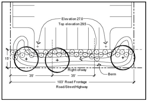 If the parking area exceeds 30,000 square feet in area, then such landscape screen shall be a minimum of 15 feet in width and shall contain a berm with a minimum height of two and one-half feet above the finished elevation of the parking area. Such berm shall have a maximum slope of one foot of rise to two feet of run and a minimum crown of three feet. In addition to the required berm, one tree of a species approved by the building code administrator having at least a three inch DBH and ten shrubs per 35 linear feet of street frontage shall be required. (See Figure 2)