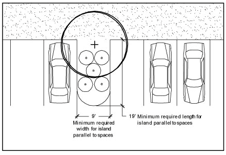 The minimum width for a landscape island or peninsula that is parallel to a parking space shall be nine feet, and the minimum length for the same shall be 19 feet. Each landscape island or peninsula shall contain a minimum of one tree of a species approved by the building code administrator having at least a three inch DBH and five shrubs. (See Figure 6)