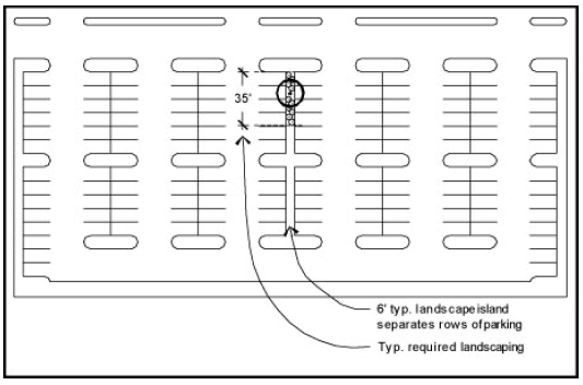 Every third group of rows of parking spaces shall be separated from one another by a six foot landscape island that extends the entire length of the row of parking spaces. Such landscape island shall contain one tree of a species approved by the building code administrator having at least a three inch DBH and ten shrubs per 35 linear feet. (See Figure 7)