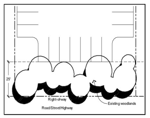 A 25-foot strip of undisturbed woodlands preserved between the parking area and right-of-way shall be permitted in lieu of the requirements set forth in subsections (g)(1) a. and b. (See Figure 3)