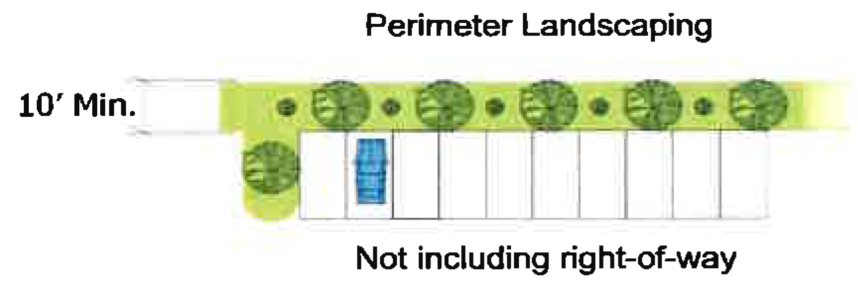 Perimeter Buffer. When an off-street parking or vehicular circulation area is located in a street yard, there shall be a landscape area along the entire perimeter of the parking area of not less than 10 feet in width. When the 10 foot width cannot be provided, the width may be reduced to a minimum of 5 feet. With any reduction in width, a two (2) foot width of permeable pavement shall be provided adjacent to the landscape area for each one (1) foot, or any portion thereof, of width reduction. When an off street parking or vehicular circulation area is located in the side yard, and where the zoning district requires a side yard width of five feet or greater, there shall be an improved landscape area along the entire perimeter of the parking area of not less than 5 feet in width. The required width of all perimeter buffers must be within the property lines of the site. Existing trees should be preserved and utilized to contribute to the required screening of the off-street parking area where possible. Plant material including trees, shrubs and/or perennials shall be included throughout the perimeter buffer area. Off-street parking areas are encouraged in the rear yard when vehicular access is possible between adjacent structures. Landscaping shall not encroach on public right-of-way or sight triangles unless specifically authorized.