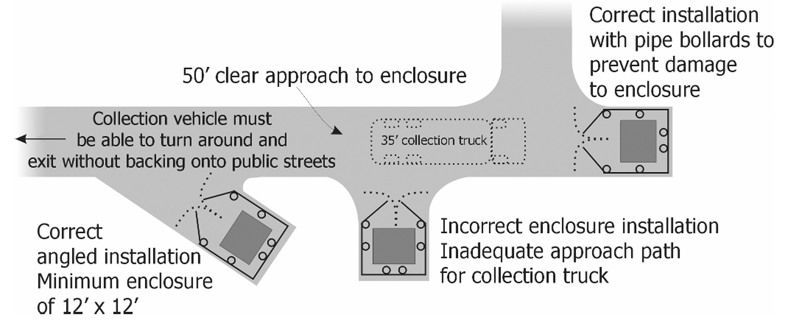 No container used for refuse collection, recycling, trash compaction or the holding of grease shall be located in a yard abutting residential property. If the applicable use is surrounded by residential properties, then the facility shall be located a minimum of 25 feet from any side or rear property line.