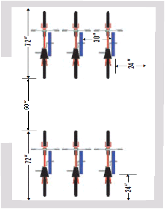 Design - Each bicycle parking space shall be sufficient to accommodate a bicycle at least six (6) feet in length and two (2) feet wide, and shall be provided with some form of stable frame permanently anchored to the ground or the building structure to which a bicycle frame and both wheels may be conveniently secured, with at least two points of contact with the bicycle, using a chain and padlock and/or U-shaped locking device. Figure I shows the types of racks that are recommended and those that may not be used. The separation of the bicycle parking spaces and the amount of corridor space shall be adequate for convenient access to every space when the parking facility is full. Figure 2 shows the minimum dimensions for bicycle racks in open or enclosed areas.