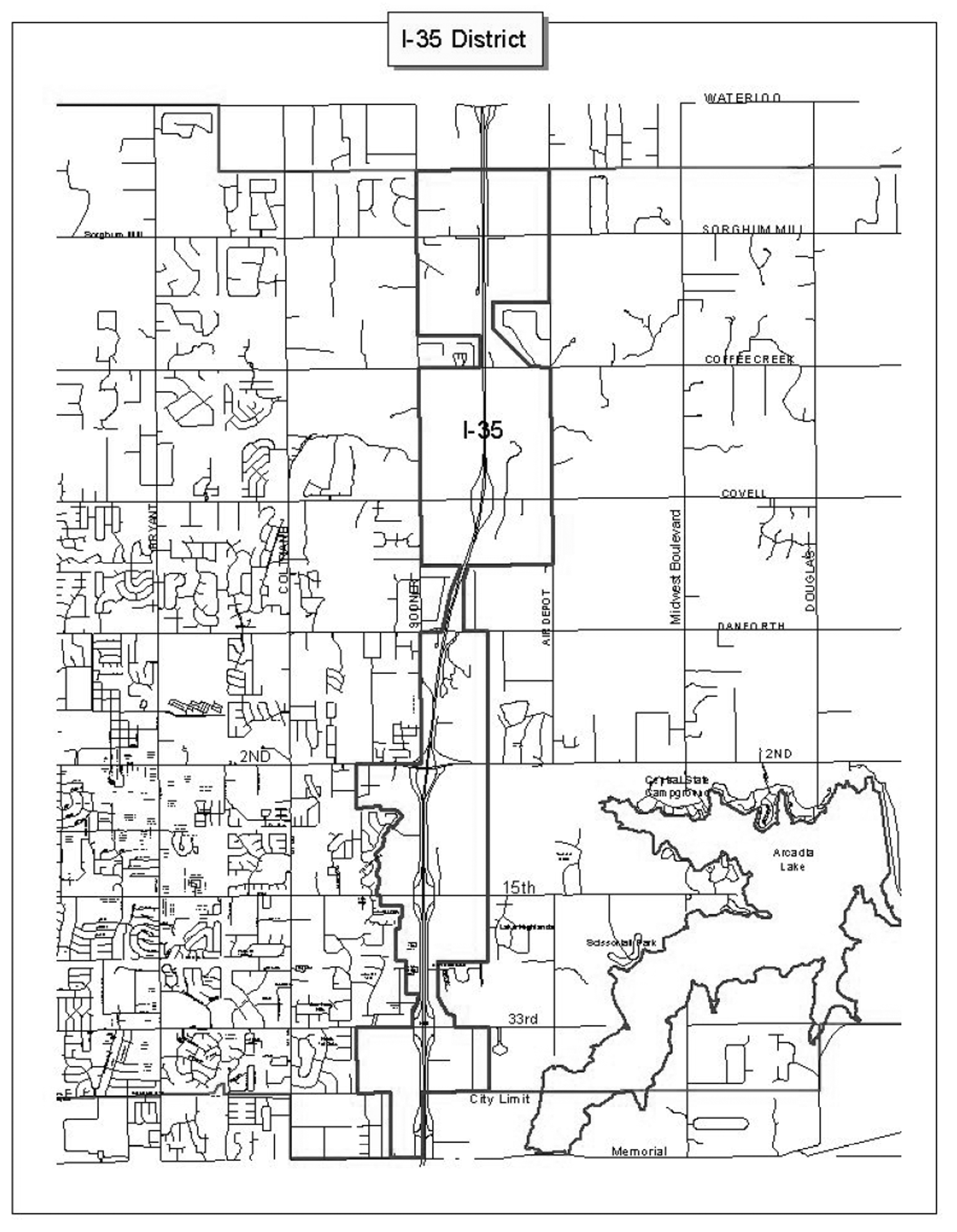The Route 66 Corridor District shall be defined as any property having frontage along Route 66 or within 600' either side of the center line of Route 66, between a point one-half mile west of the center line of Air Depot Boulevard (also the eastern edge of the I-35 Corridor District) and the center line of N. Westminster Road.