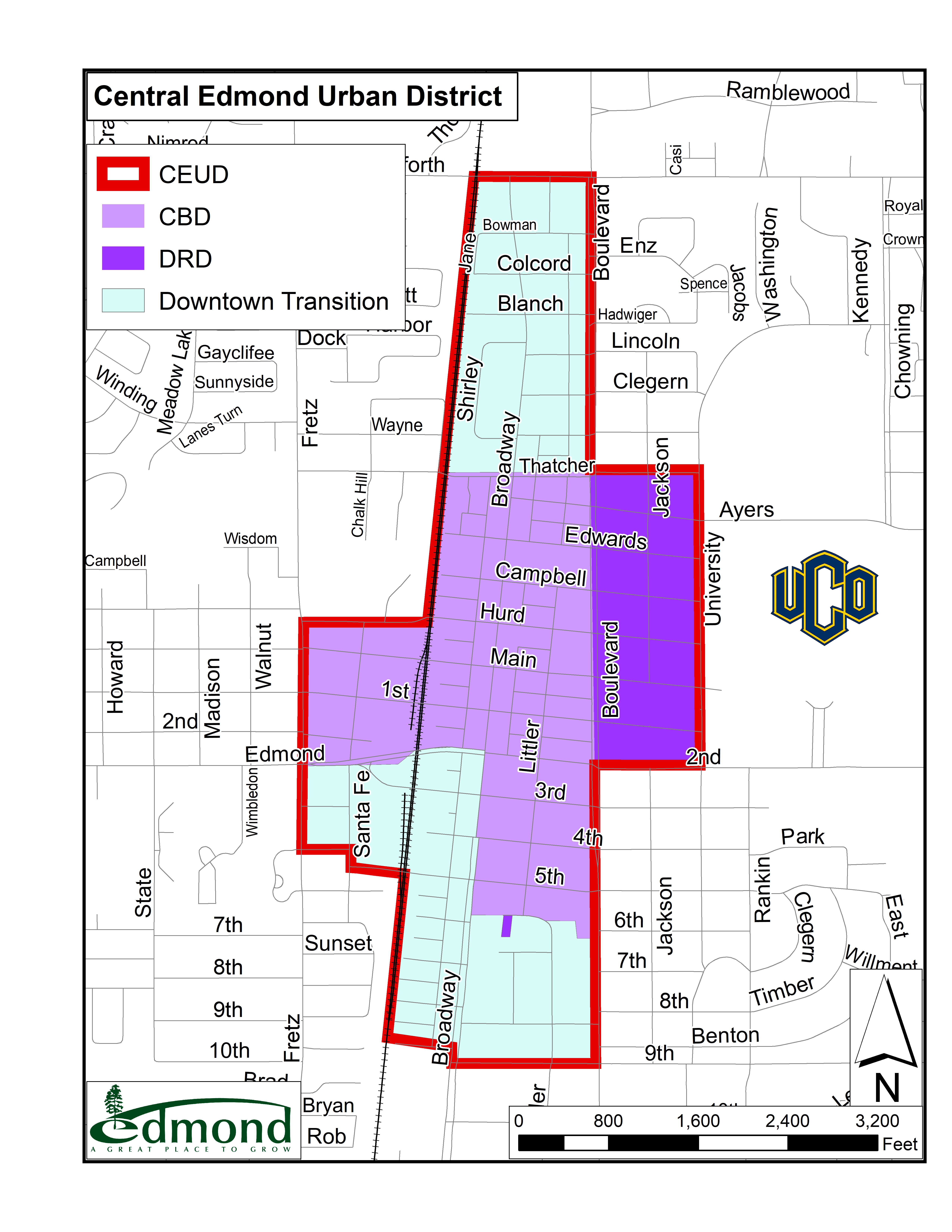 Promote the development of pedestrian features through the Central Edmond Urban District (CEUD) that shall link the Downtown Core Area to surrounding Transition Areas as well as to the campus of the University of Central Oklahoma, which is recognized as a part of the CEUD;