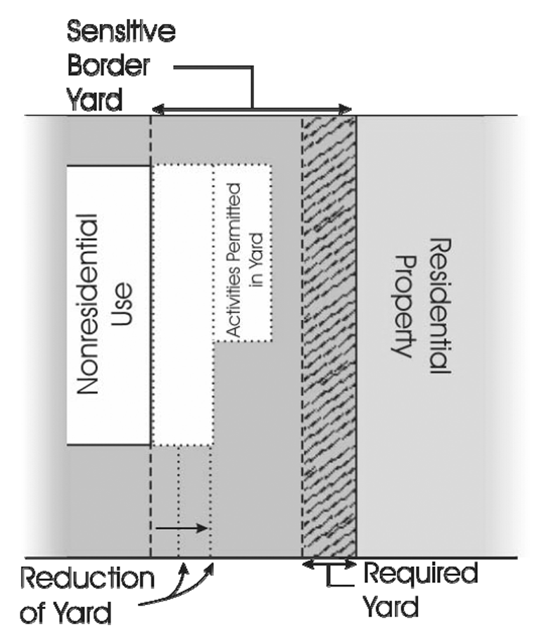 Base Yards. Notwithstanding the requirements of Section 22.5.2, the following sensitive border yards shall apply to any applicable use when such yards abut a platted lot or developed residential property. Such yards may be reduced in accordance with paragraph (2) below.