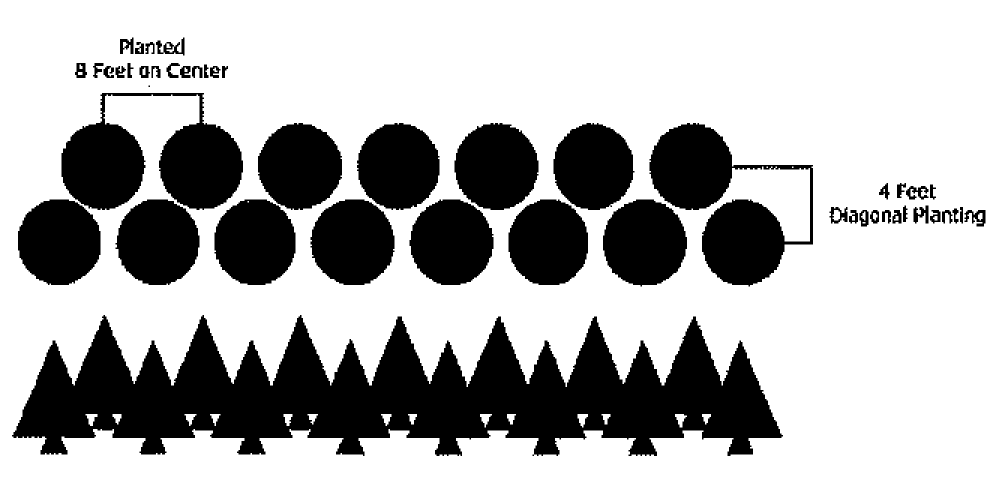 If only evergreen plantings are used, the TBY must achieve a 100 percent screen to a height of six feet upon installation. To achieve this appearance, a staggered spacing approach should be utilized as shown below.