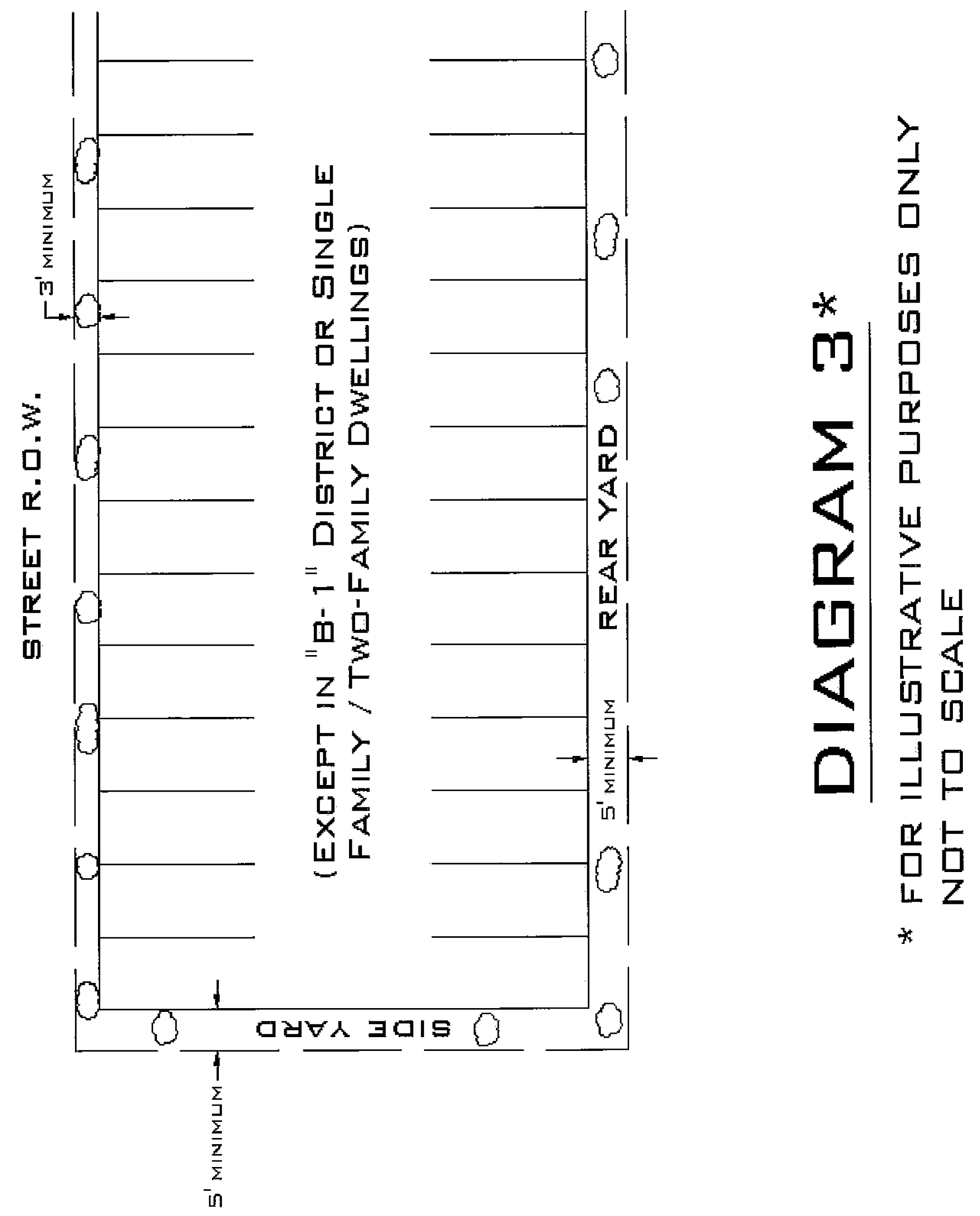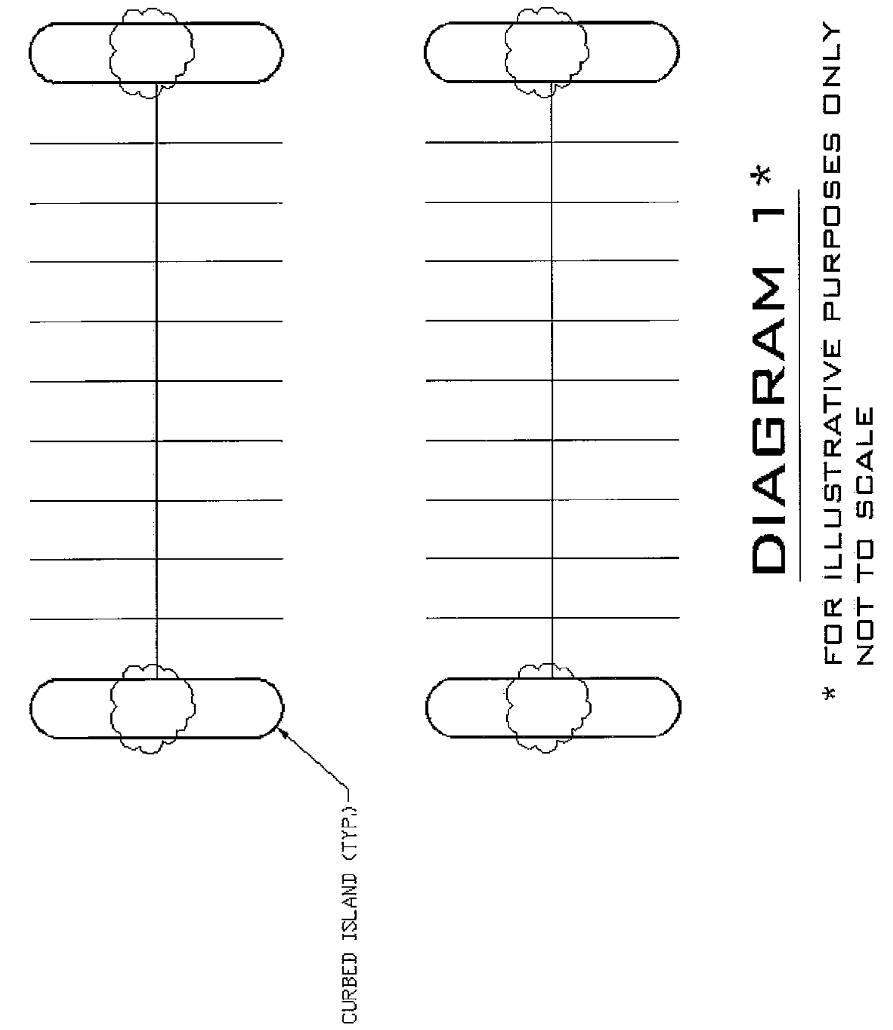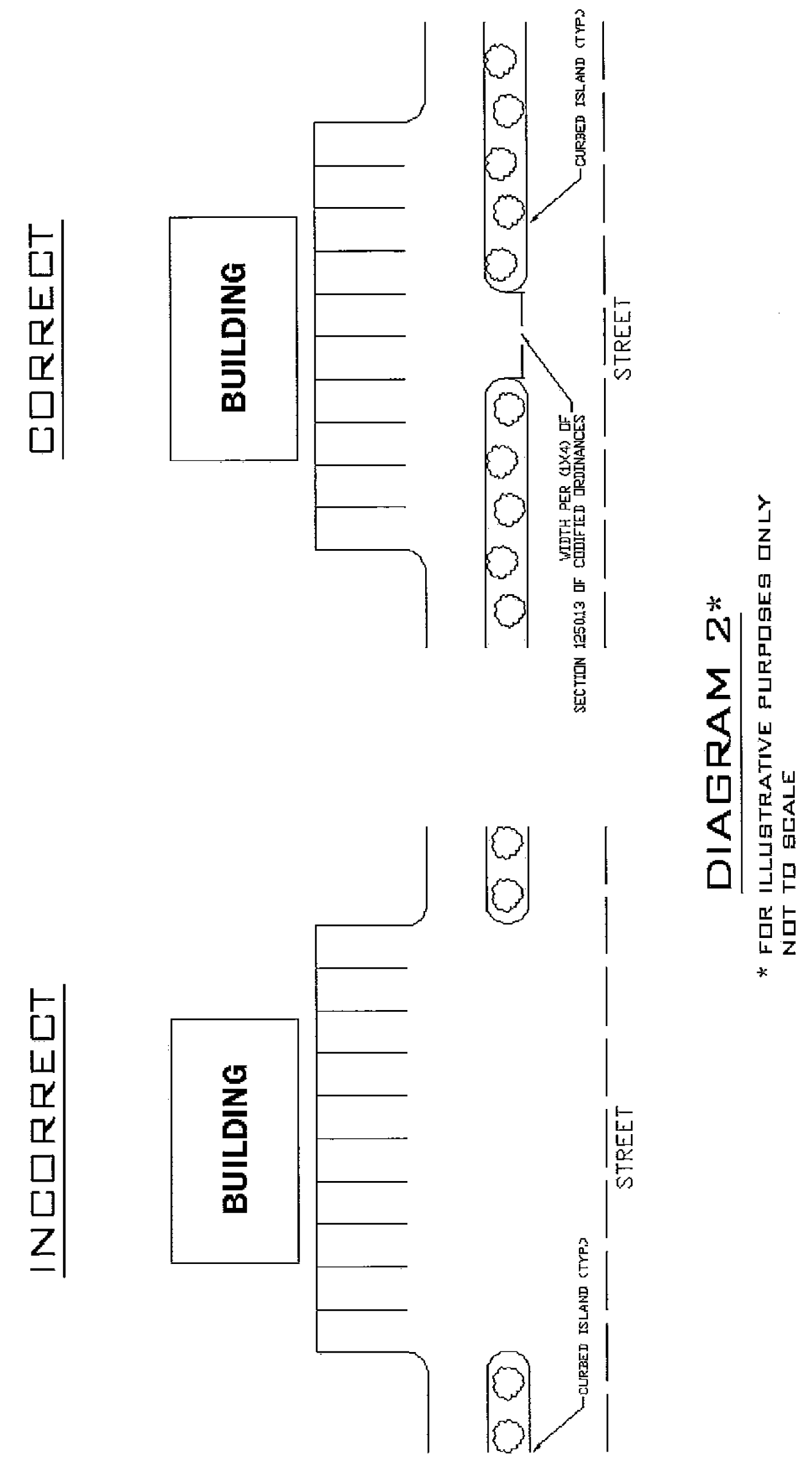 All interior landscaped areas provided within parking areas shall be raised and curbed and shall have a minimum area of 50 square feet and a minimum width of five feet measured from the back of curbs. Each separate interior landscaped area shall include at least one deciduous shade tree of not less than two and one-half inch caliper size as measured six inches above the ground and with a clear trunk of five feet to prevent obstruction of vehicular sight lines. There shall be a minimum of two trees, within and up to, every 100 linear feet of parking for each parking row. Such trees shall be spaced evenly around the perimeter. The ends of parking rows abutting a drive aisle shall be defined by landscaped curbed islands. (See Diagram 1 of this subsection.) Said landscaping, when of shrubbery types, shall neither exceed three feet in height nor less than 18 inches in diameter. The height limitation shall be maintained at all times. Evergreen trees of a minimum height of six feet are permitted for use as perimeter plantings when located outside vehicular sight lines.