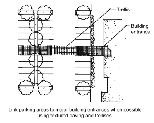 A continuous, clearly marked walkway shall be provided from parking areas and carports to main entrances of buildings in order to minimize cross-circulation between vehicles and pedestrians.