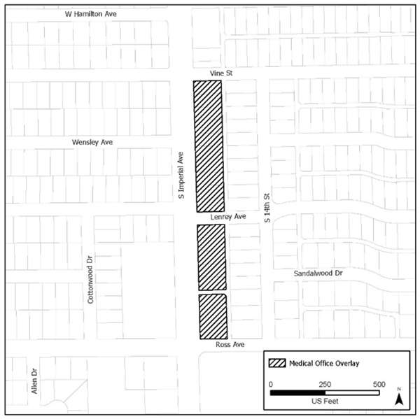 MO medical office overlay zone. This overlay zone is applied on parcels along S. Imperial Avenue shown on figure 29-92.1, in close proximity to the existing regional medical facilities and uses and provides options for residential property on lots not less than six thousand (6,000) square feet in area to transition to medical/professional office, remain single-family residential, or allow a combination of both uses in a live/work project. The underlying R1 single-family residential zoning remains in place to provide legal conforming land use status. Because potential development includes both residential and medical/professional office uses, the overlay zone includes both density and intensity standards.