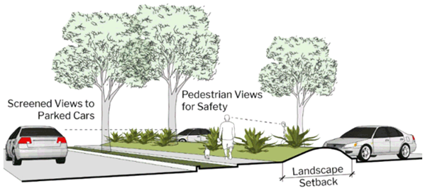 A minimum ten (10) foot-wide landscape area (trees, shrubs, groundcover) at the exterior perimeter of all parking lots. The ten (10) foot landscape area may consist of existing and established native and naturalized vegetation and new container plant material comprised of minimum of twenty-four (24)-inch box trees and one (1) and five (5) gallon shrubs and groundcover. New planting should consist of a combination of small, medium, and large-scale trees, shrubs, and groundcover. (See table 29-142.2 and table 29-142.3 for groundcover and shrub lists.).