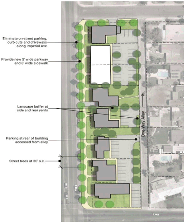 Encourage the transition from the current pattern of driveways serving each residence taking direct access from Imperial Avenue to alley-oriented access to improve safety and traffic flow along Imperial Avenue.