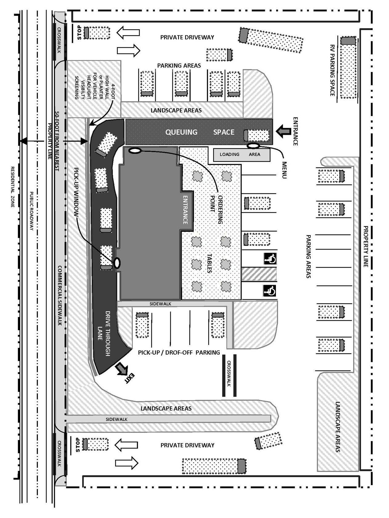 Areas for bus stop and drop off areas shall be provided for any site that has a minimum of 20 parking spaces. Bus stops and drop off areas may be waived if the parking lot is designed to provide a loop or circular path of travel so that the bus can use the parking drive aisle as a temporary bus stop.
