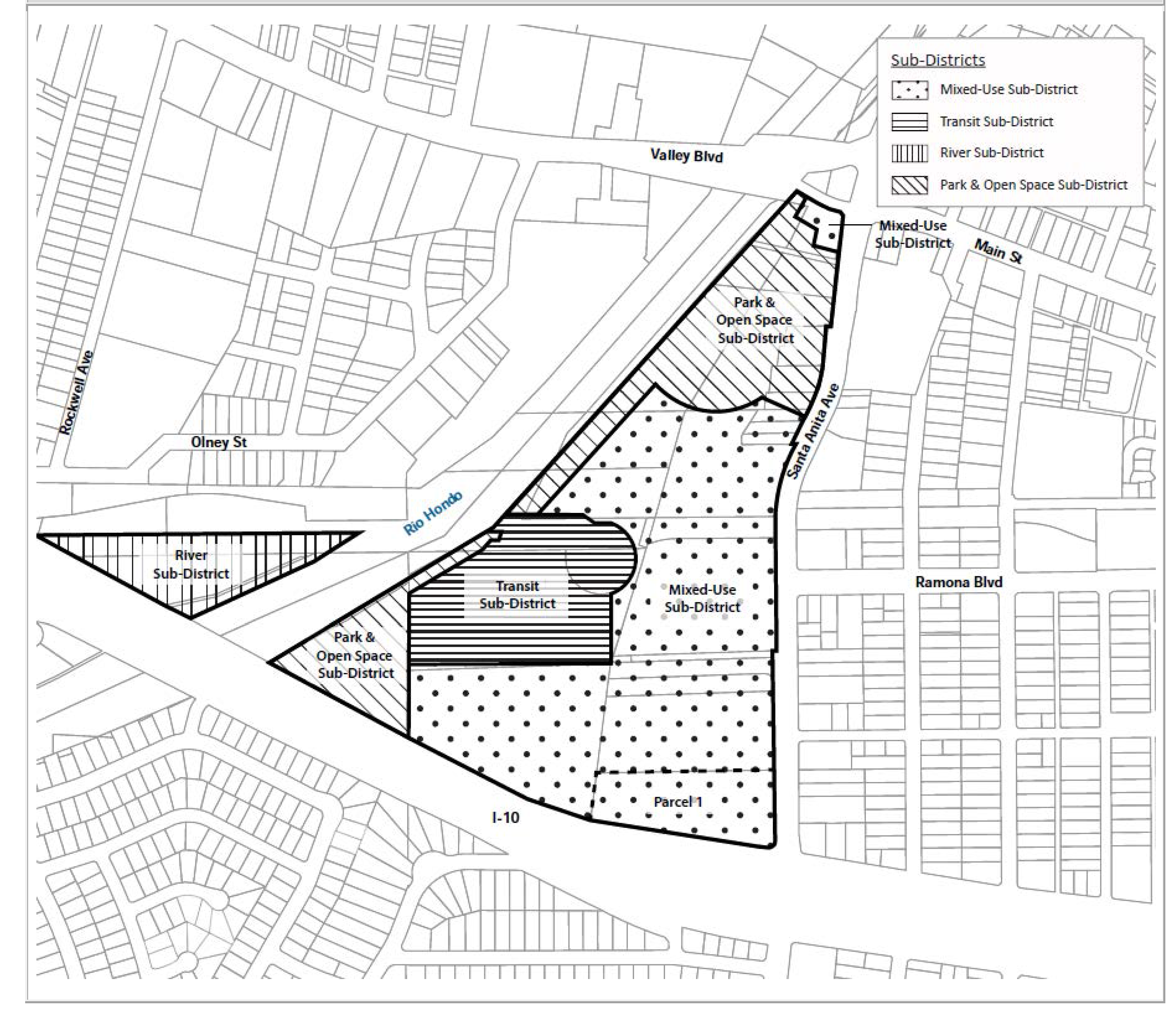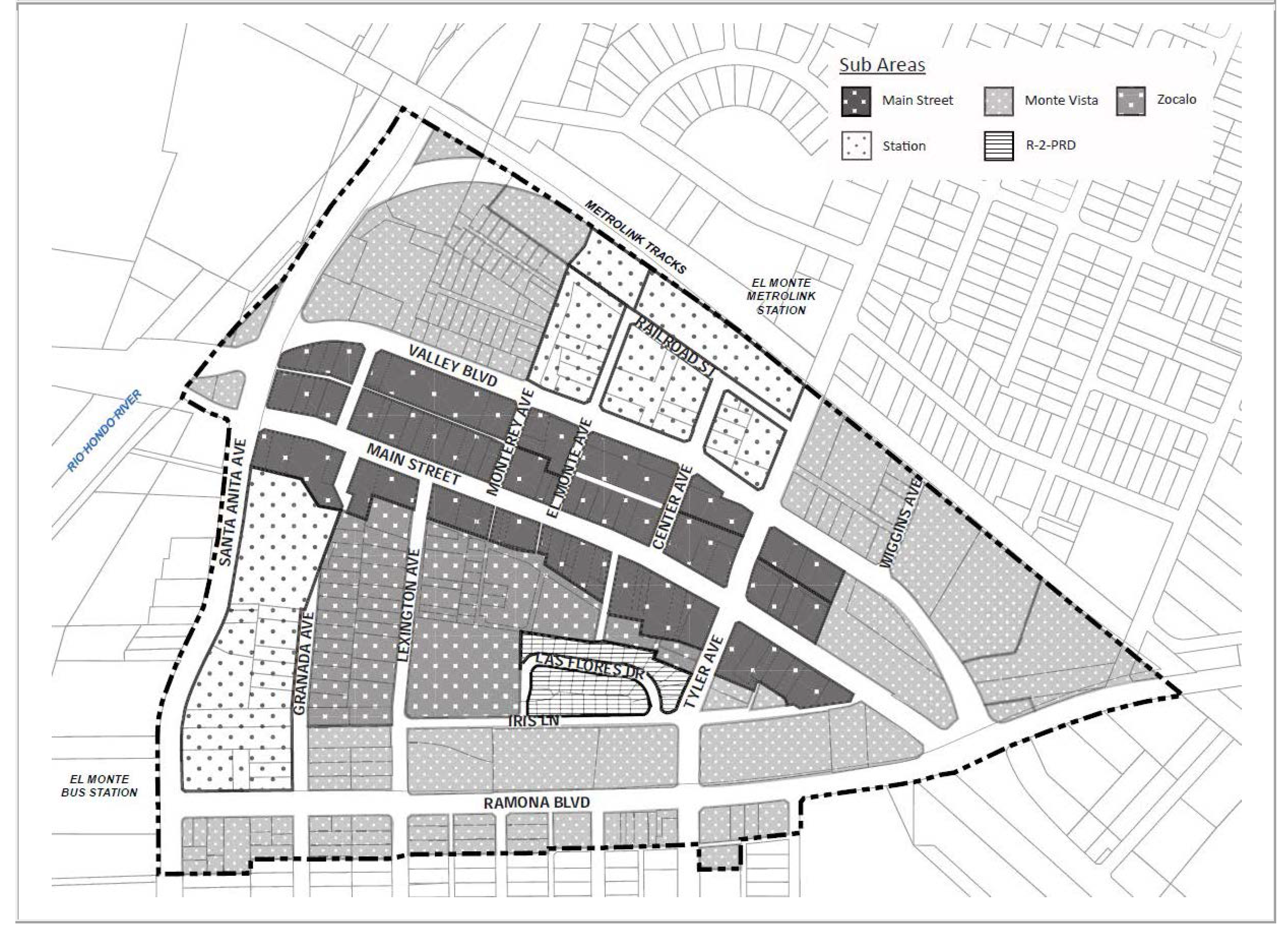 At build-out, the specific plan will serve as a key community activity center and further enhance the city's desire to create a vibrant, mixed-use downtown environment with enhanced connectivity to local neighborhoods and the region, through the Rio Hondo River, METRO and the Emerald Necklace. Each land use subdistrict is planned around a variety of creative and functional physical connections that incorporate the unique opportunities of the project site, including the El Monte Bus Station and the Rio Hondo River. The following describes the envisioned land use mix for each of the four (4) subdistricts, as well as their relationship to each other and the surrounding environment. Refer to Figure 17.131-1 for a map of the subareas.