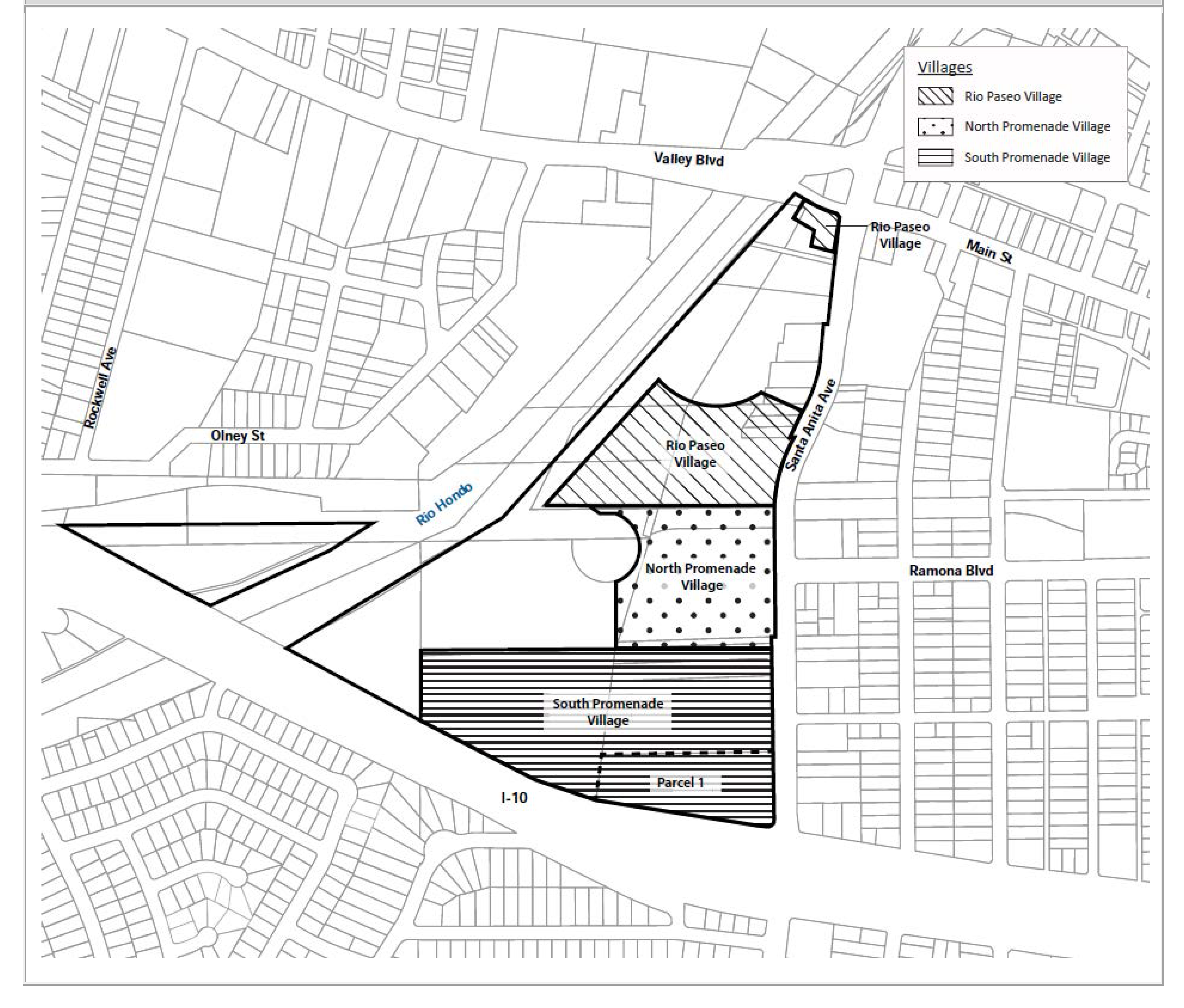 Mixed Use (MU) Subdistrict—The Mixed Use Subdistrict is intended to provide a complimentary mix of residential, commercial, entertainment and retail uses. Mixed use development is encouraged in vertical and horizontal forms, providing for an interaction between various land use types to encourage pedestrian utilization throughout the subdistrict. The area northwest of Santa Anita Avenue and Brockway Street is intended to provide the southern gateway into the Gateway Specific Plan. Design guidance for this sub-district is provided through three (3) distinct "villages," including the: Rio Paseo; North Promenade and South Promenade Villages.