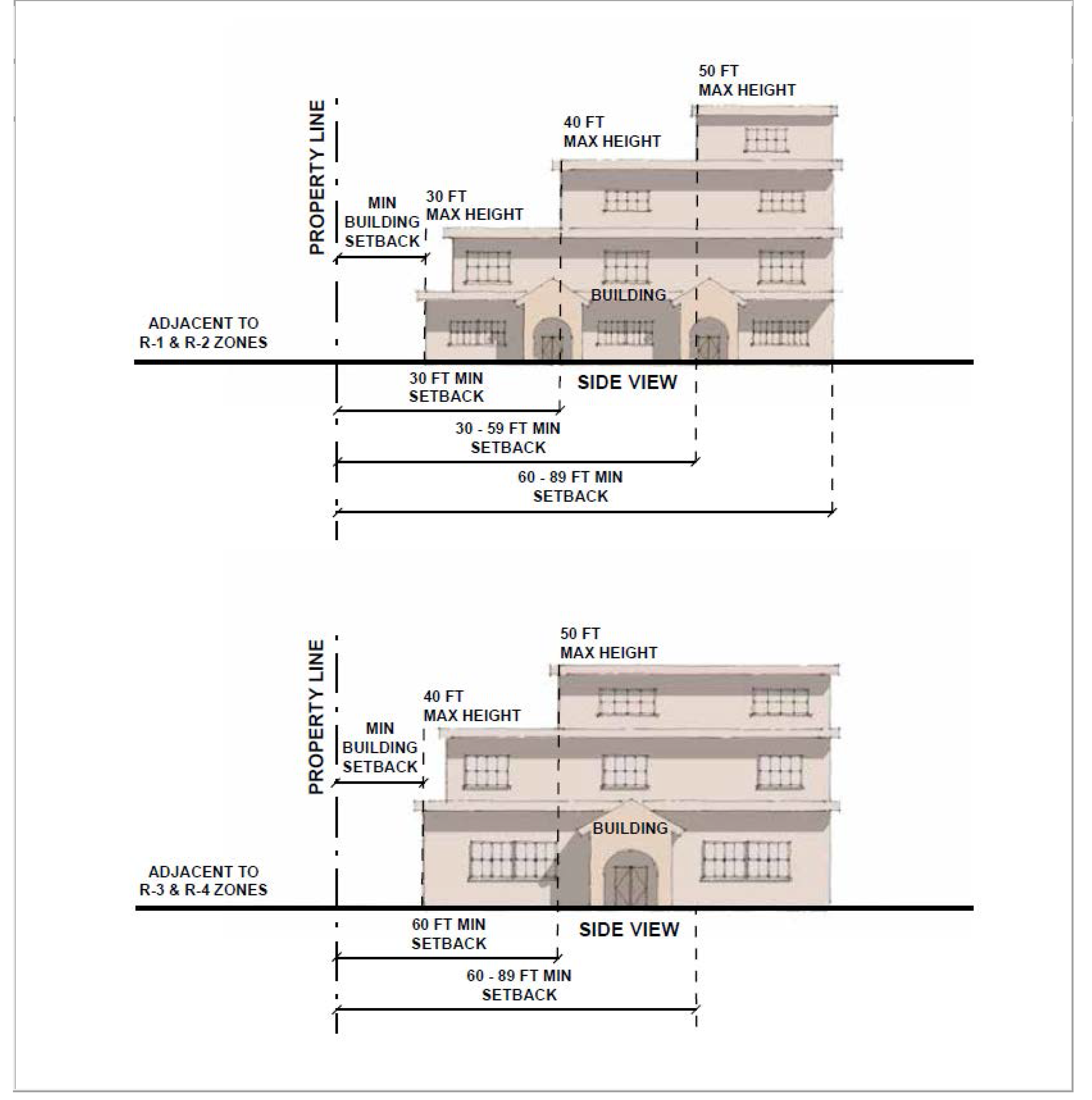 Variable Height Requirements. With the exception of what is permitted in subsection A above, Table 17.60-1 prescribed the maximum height limits when adjacent to certain zoning districts. Refer to Figure 17.60-2 for information in a graphics form.