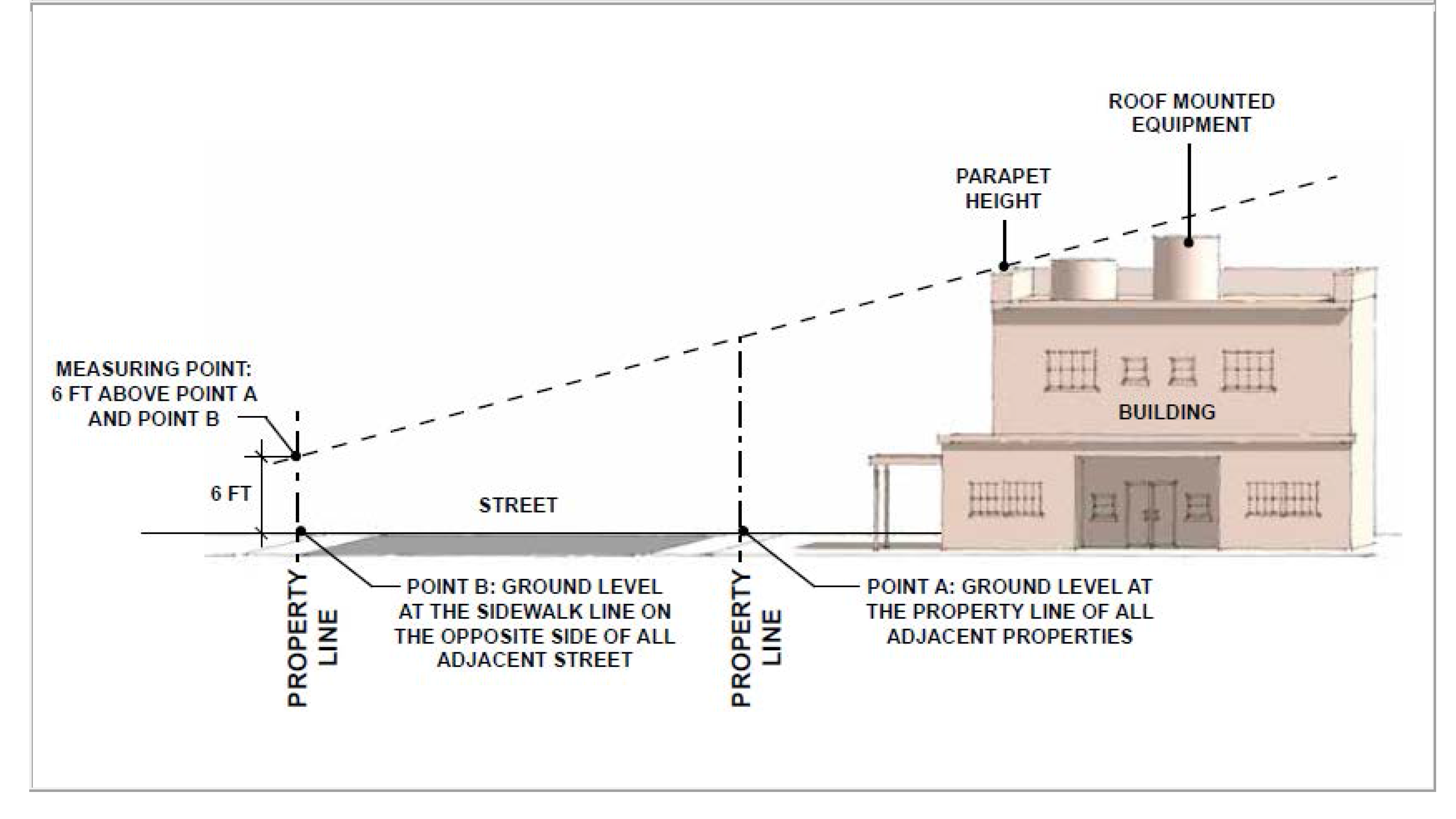 As demonstrated through line-of-sight diagrams. The measuring point shall be six (6) feet above the ground level at the property line of all adjacent properties and at the sidewalk line on the opposite side of all adjacent street.