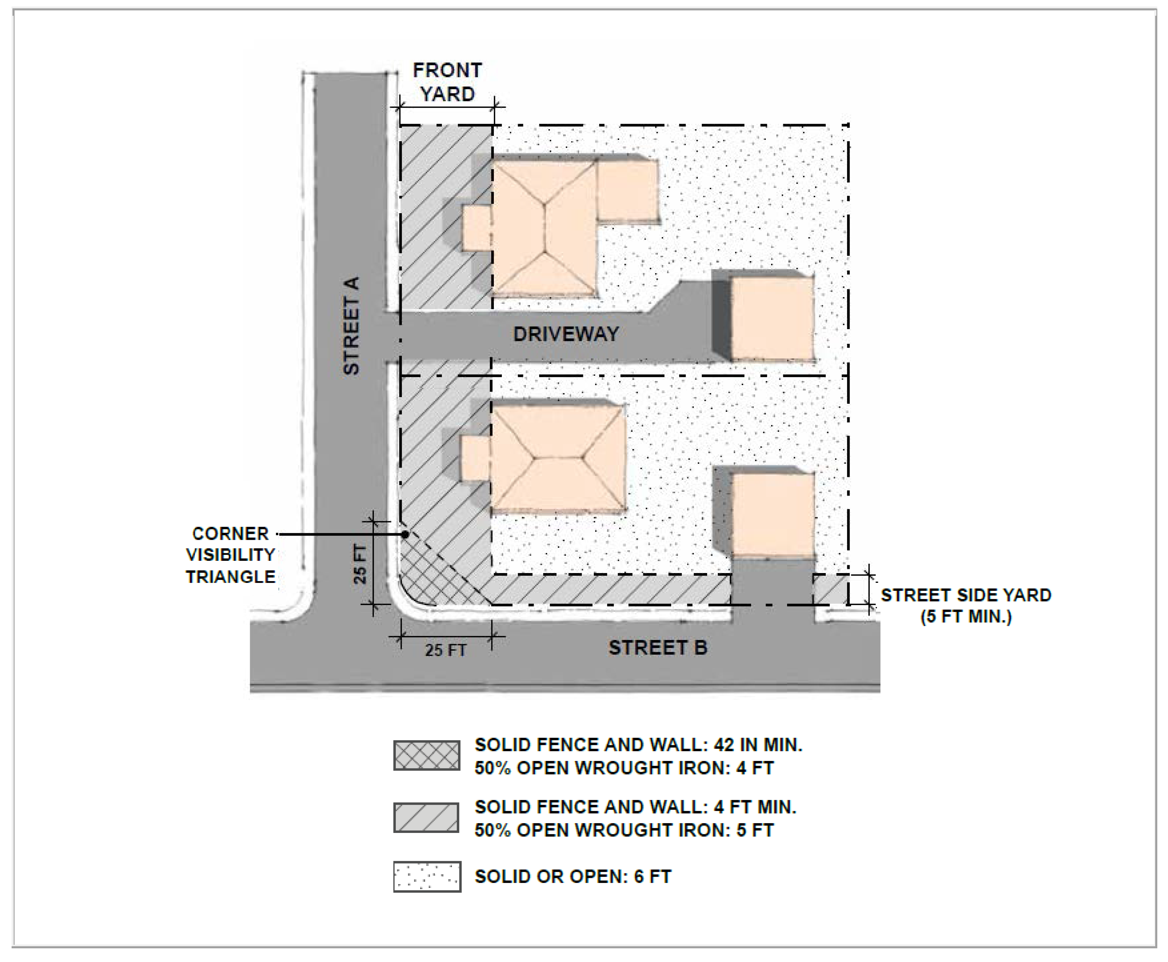 Corner Yards. Solid fences, walls and hedges located in the corner visibility triangle area or a corner lot shall not exceed a height of forty-two (42) inches. However, a maximum four-feet high fence may be constructed, provided it is a minimum fifty (50) percent open and made of decorative wrought iron with decorative block pilasters. The corner visibility triangle area is the point measured along the property frontage at the curb line (or edge of pavement lines) for a length of twenty (20) feet along both lines from the intersection.