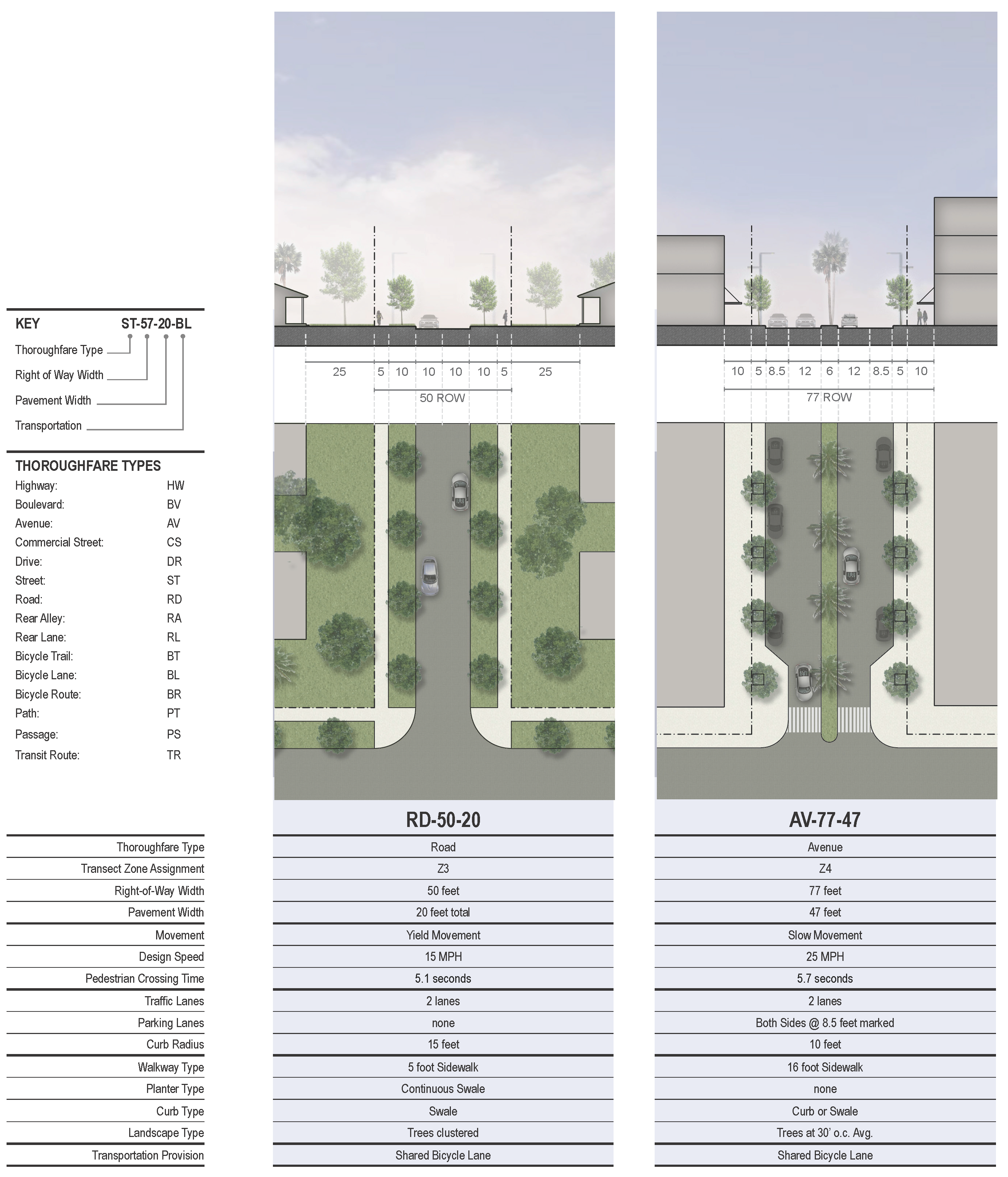 Within the zones (Z3 through Z5), pedestrian comfort shall be a primary consideration of the Thoroughfare. Design conflict between vehicular and pedestrian movement generally shall be decided in favor of the pedestrian.