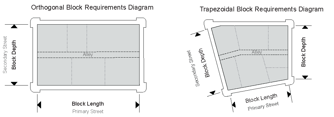 Blocks: Blocks shall be either orthogonal (rectilinear) consisting of square or rectangular designs or shall be trapezoidal and irregular in shape. See Article VII. Figure 1: Block Requirements.