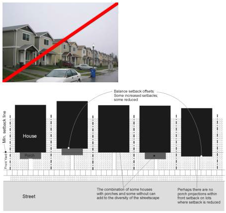 Providing a diversity of floor plans and facade treatments that avoid monotonous streetscapes. This could be accomplished with provisions on the plat and/or special covenants required for lots.
