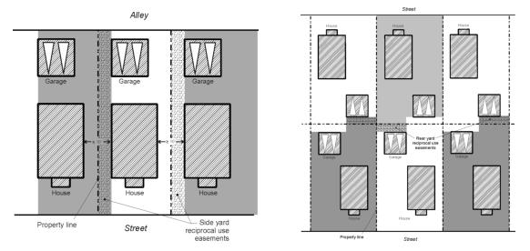 Reciprocal use easement lots. This works similar to the zero lot line configuration, except that the dwelling units and accessory structures meet the standard setbacks and easements are granted on one side yard to allow consolidated use of the side yards by the adjacent property (see figure 15.420.050(B) for example). Also, configurations providing for reciprocal use easements in the rear yard are allowed to maximize usable open space (see figure 15.420.050(B) for example). Standards/provisions: