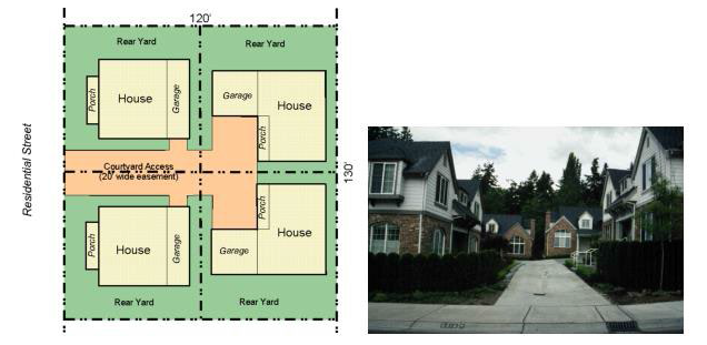 Courtyard access lots. This includes a series of lots clustered around a private internal roadway. Standards: