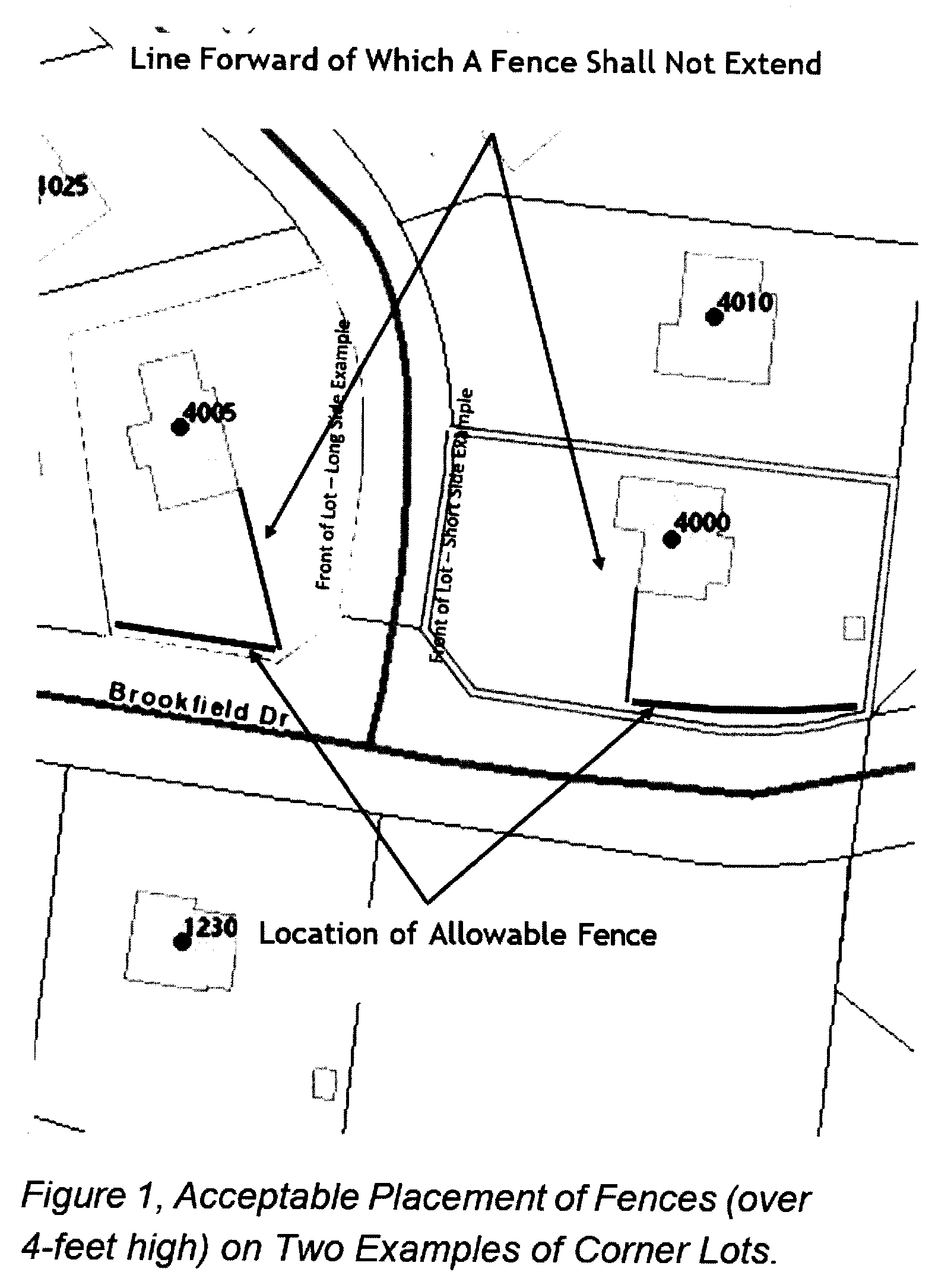 Fences over four-feet high on corner lots. For establishing the allowable location of fences over four feet high on corner lots, the front of the lot shall be established consistent with the definition of the term "lot, front of" in section 17.04.020 and no such fence shall be permitted there. such fence may be permitted along the side not qualifying as the front, provided the fence shall not extend closer to the established front of the lot than the nearest front corner of the principal building. Figure 1 illustrates the application of this standard to two example corner lots.