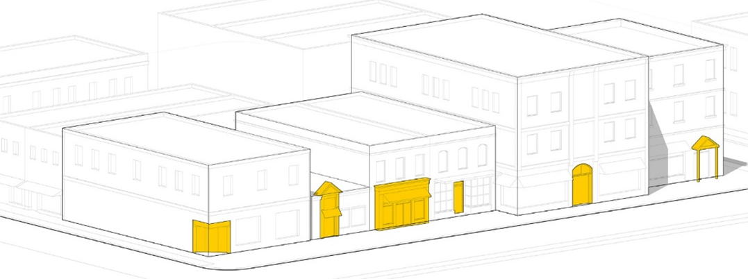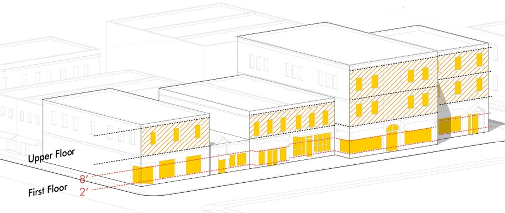 Locate doors and windows in a way that activates spaces, creates connections to important exterior spaces, and promotes economic activity at the interface of buildings and public spaces.