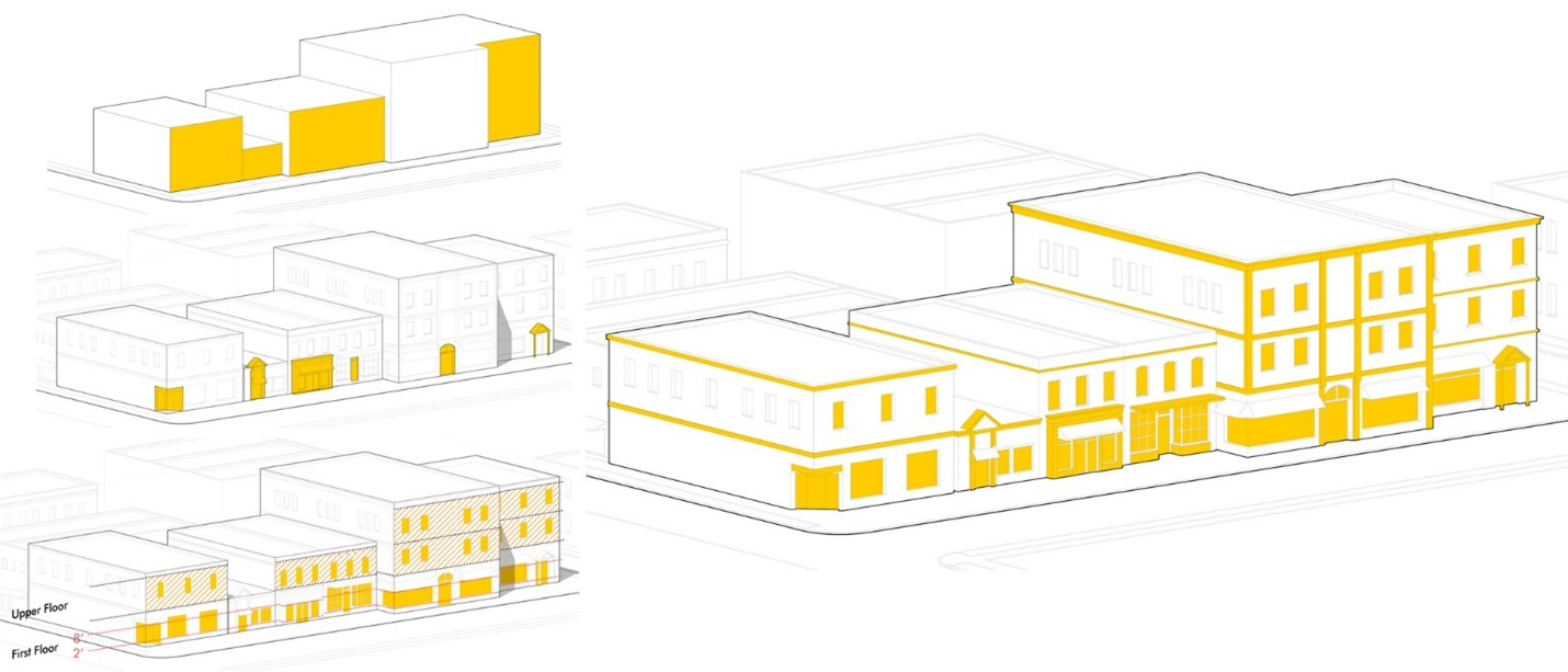 Relate buildings to adjacent development by mimicking similar scale, massing, and proportions though step-backs and secondary masses that break up larger buildings.